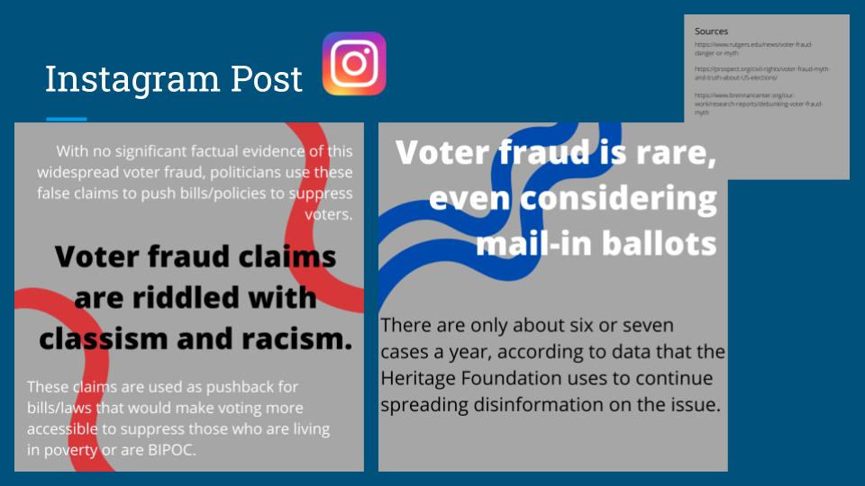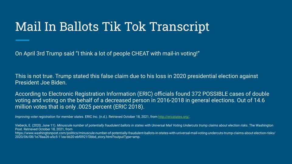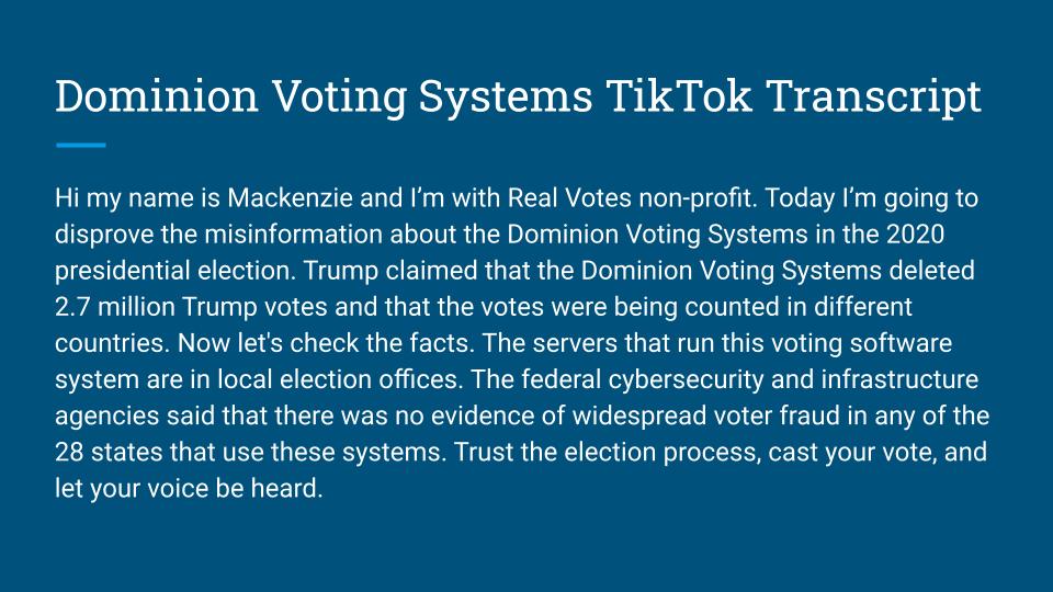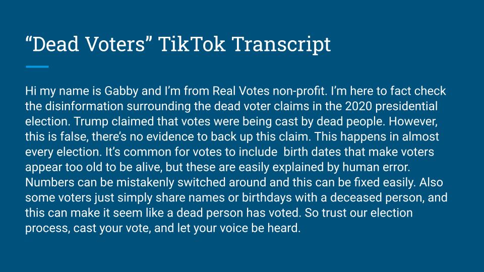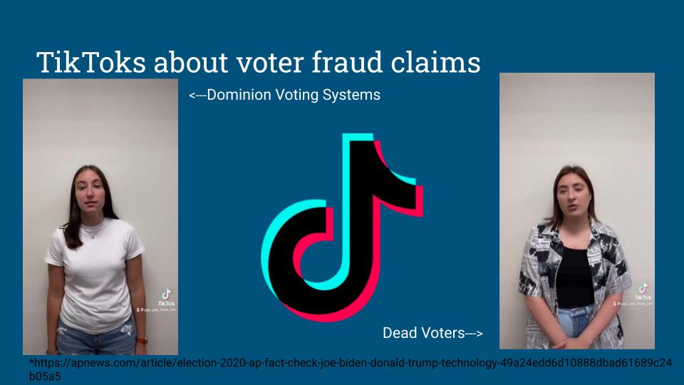 This is a group project for class. Our objective was to create a campaign about disinformation and misinformation. My group decided to focus on the voter fraud claims in the 2020 elections. My role in the project was to develop the TikTok videos and research the information shared in them. I also took part in creating the PowerPoint.